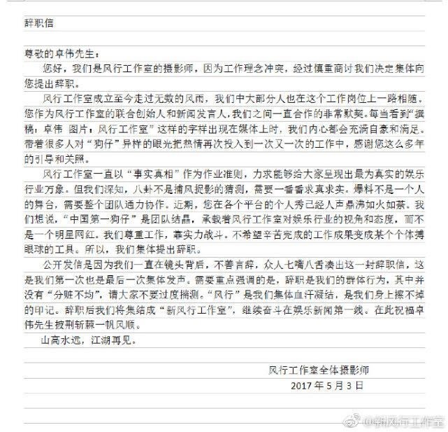 辞职信中表露的不满,集中在狗仔理念不合问题上。“爆料不是一个人的舞台,需要整个团队通力协作。近期,你在各个平台的个人秀已经人声鼎沸如火如荼。我们想说,‘中国第一狗仔’是团队结晶,承载着风行工作室对娱乐行业的视角和态度,而不是一个明星网红。”