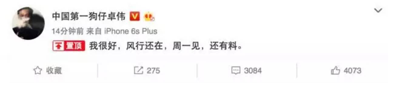 嘴硬的卓大大通过个人微博回应:“我很好,风行还在,周一见,还有料。”临危不忘打广告,卓伟老师棒棒哒。