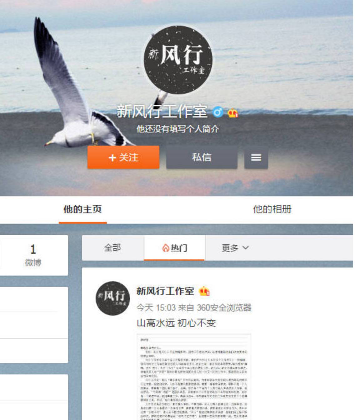 “新风行工作室”的官微有了,就一句话:山高水远,江湖再见。