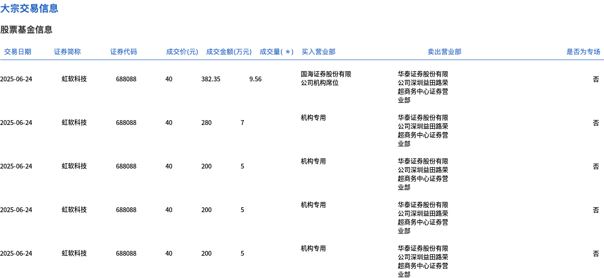 6月24日,虹软科技大宗交易成交31.56万股,成交额1262.35万元,占当日总成交额的4.27%,成交价40元,较市场收盘价46.65元折价14.26%。