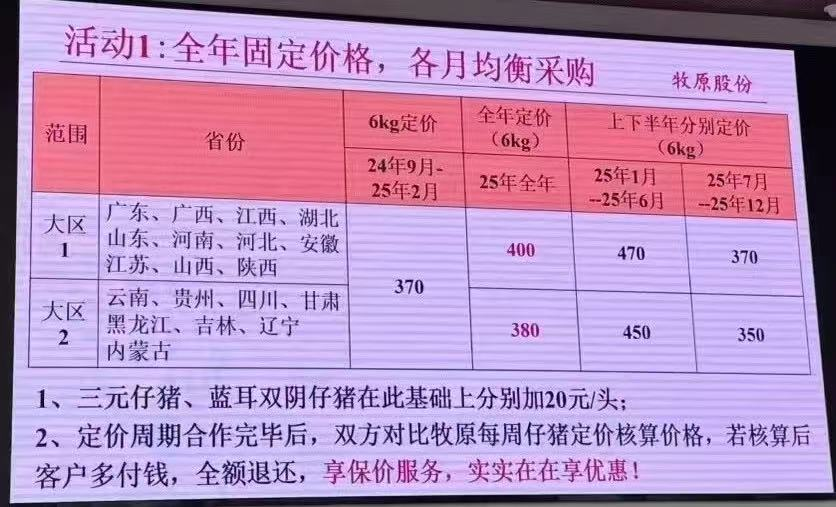 三是按照上、下半年来定价。2025年1-6月份,大区1和大区2价格分别为470/头、450元/头,2025年下半年大区1、大区2各降100元/头。
