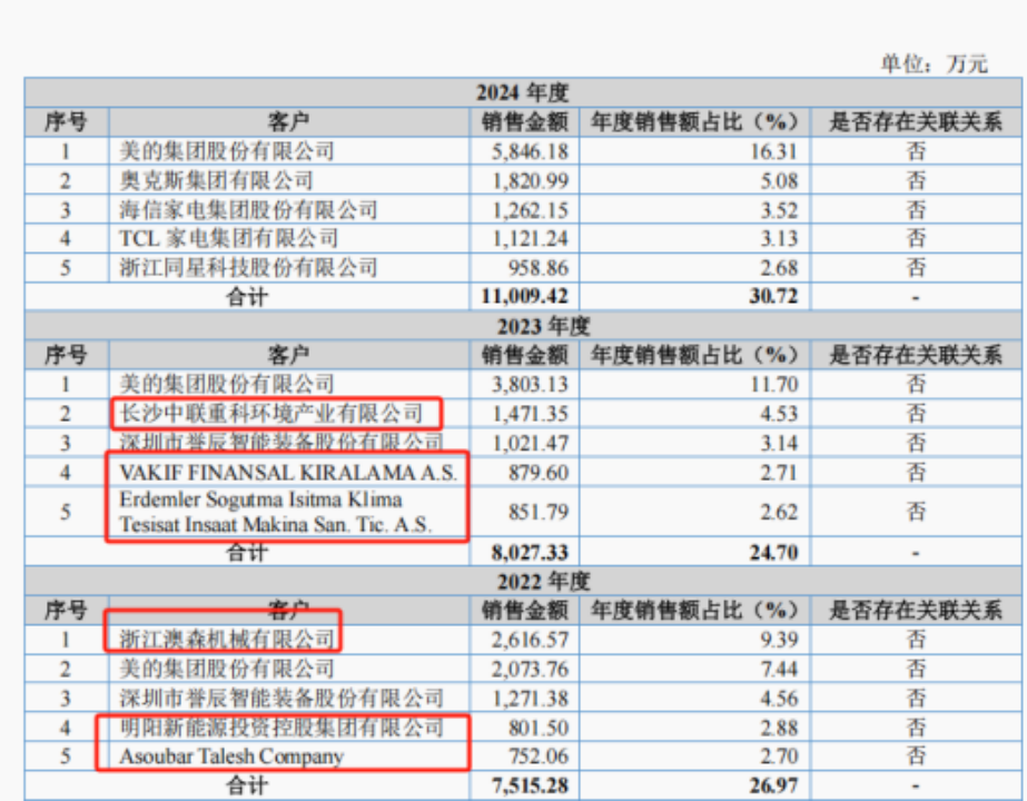2023年,长沙中联重科环境产业有限公司、VAKIF FINANSAL KIRALAMA A.S.和Erdemler Sogutma Isitma Klima Tesisat Insaat Makina San. Tic. A.S. 3家企业,销售金额分别为1471.35万元、879.60万元、851.79万元。2024年,三家客户均“消失”。
