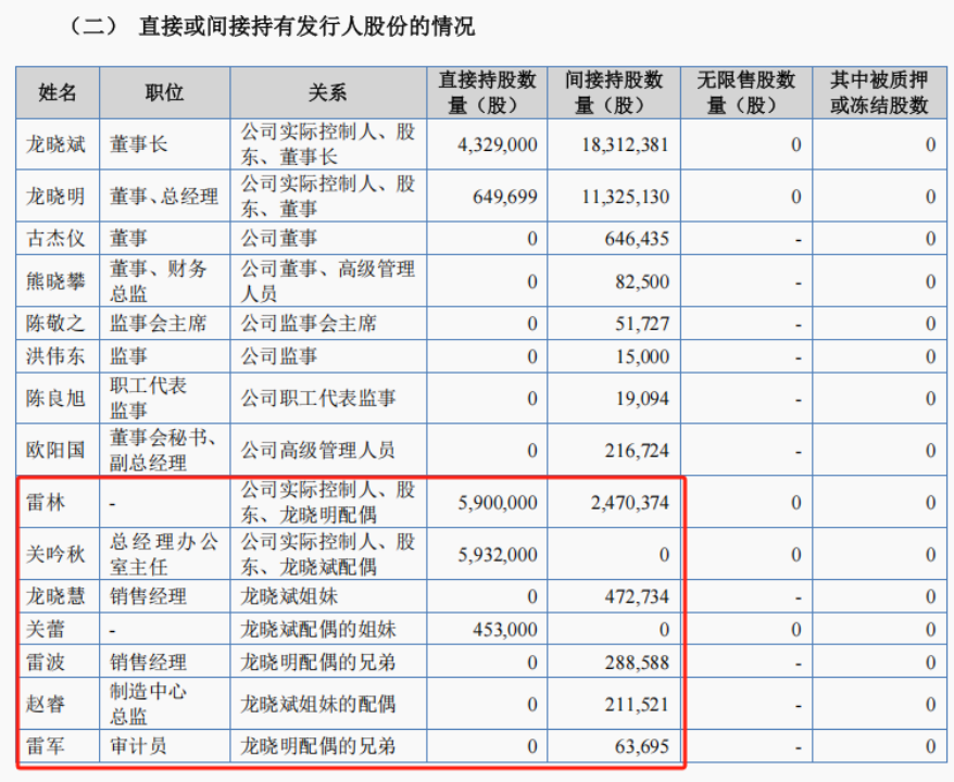 除直接或间接持股外,他们还在公司财务、生产等核心环节担任关键岗位,如龙晓斌姐妹的配偶赵睿担任制造中心总监、雷林兄弟雷军担任审计员、龙晓斌姐妹龙晓慧与雷林兄弟雷波均担任销售经理。这使得实控人家族在财务决策、生产管理、销售渠道等关键领域拥有实质话语权。