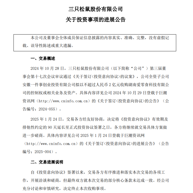 按照三只松鼠公告中的说法,此次收购终止原因系“双方就部分核心条款未达成一致”。