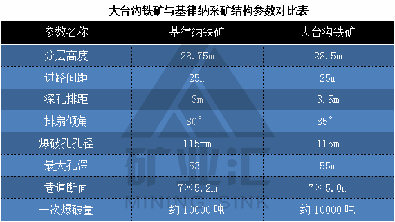 大台沟铁矿与瑞典基律纳铁矿1365米新水平的结构参数相似,分段高度28.5米,进路间距25米,崩矿步距3.5远远超出国内同类矿山,在世界上也处于领先水平。