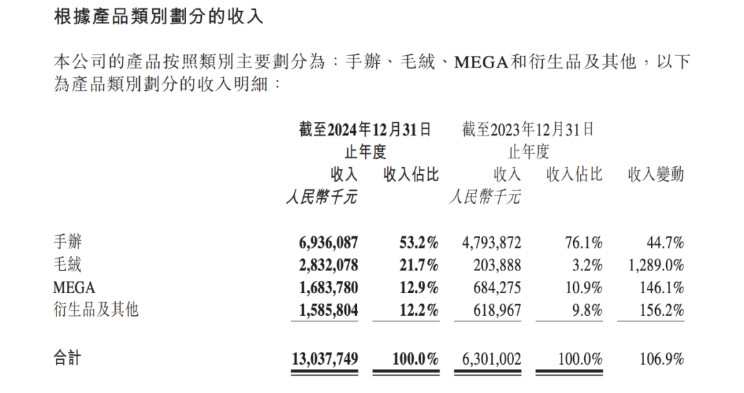 其次是品类结构的拓宽,Labubu从手办转向可佩戴、易携带搪胶毛绒挂件后,带动了毛绒品类营收暴增1289%。该品类的营收占比也从第四提升至第二位,仅此于手办品类。