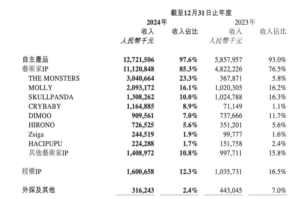 2023-2024年 各IP营收占比,图源 / 公司2024年财报