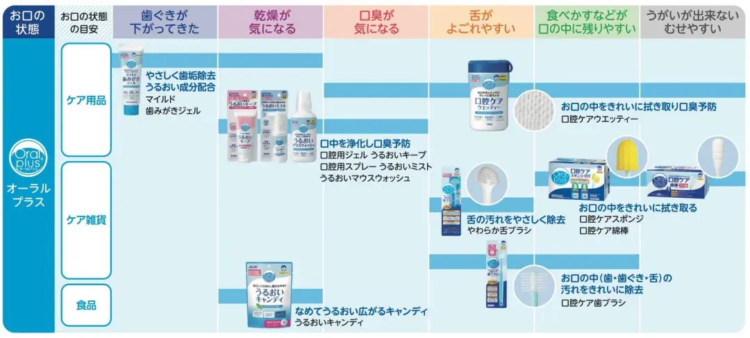 Oral Plus的产品细分为6大系列:口腔清洁、口腔干燥、口臭、舌头清洁、口腔食物残渣清洁、无法漱口人群的口腔清洁。