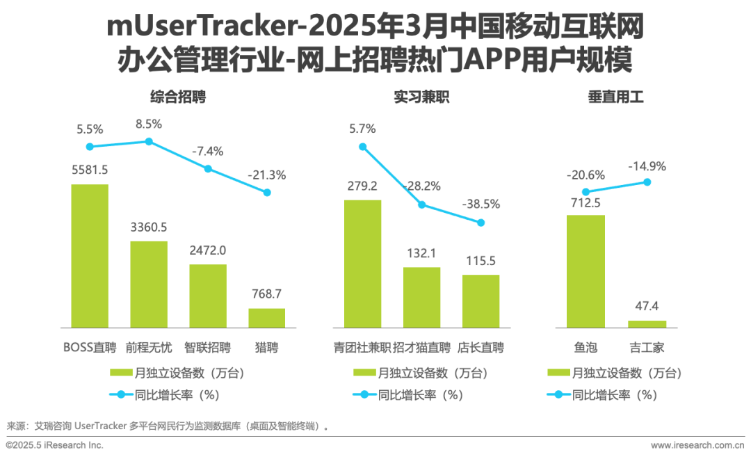 综合招聘平台中BOSS直聘、前程无忧逆势增长,实习兼职与垂直用工类APP流量分化明显