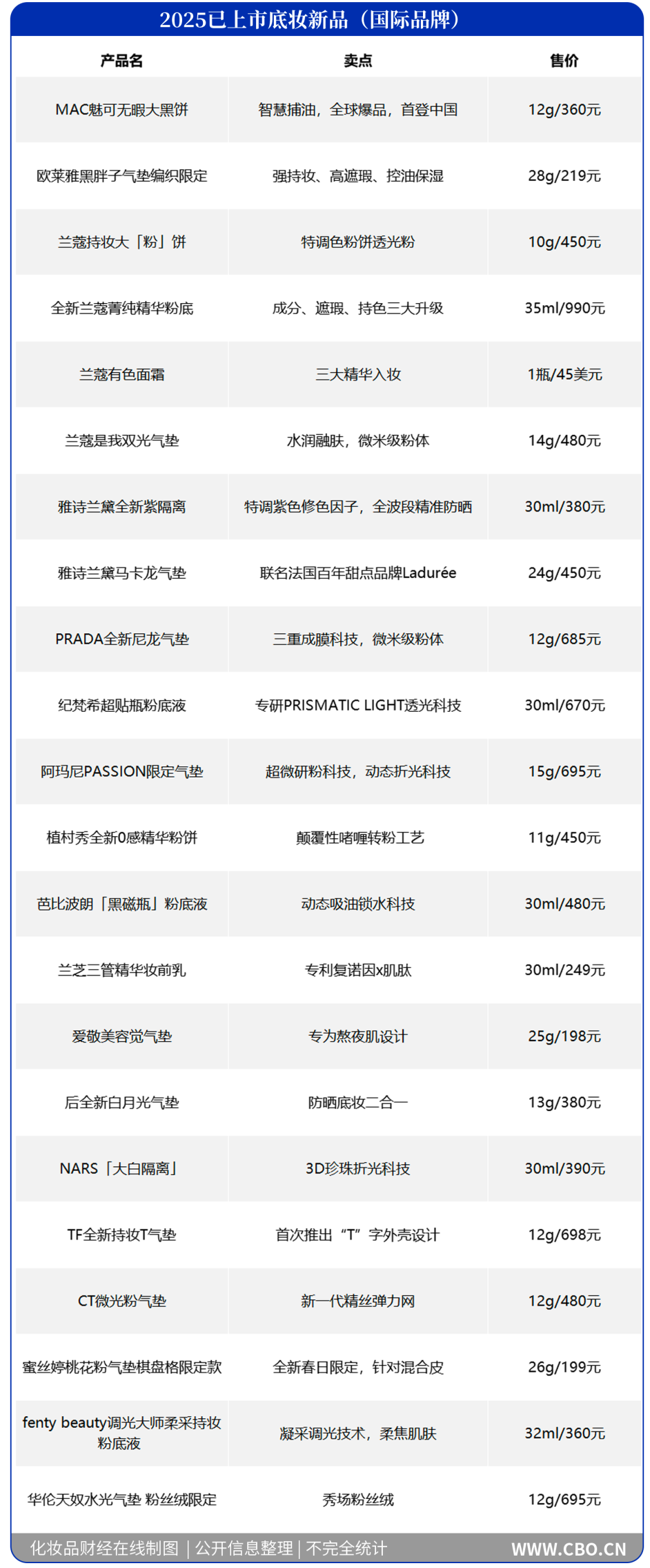 从上新频率看,今年,外资品牌上新率不及国货品牌。据CBO统计,主要外资美妆品牌共上新22款底妆新品。