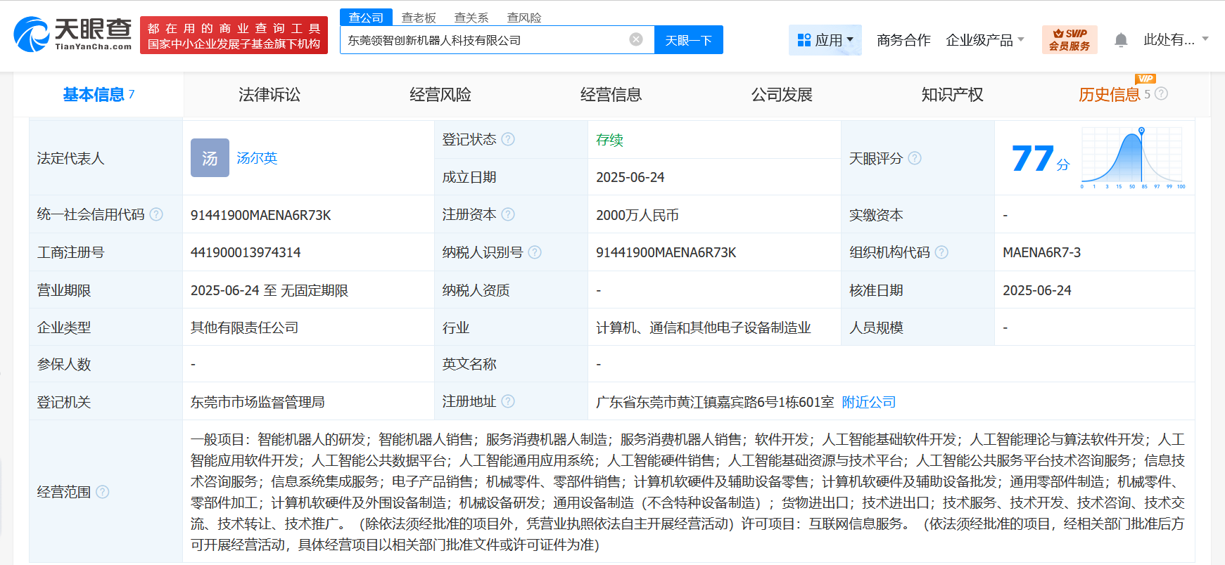 天眼查App显示,近日,东莞领智创新机器人科技有限公司成立,法定代表人为汤尔英,注册资本2000万人民币,经营范围含智能机器人的研发、智能机器人销售、服务消费机器人制造、服务消费机器人销售、软件开发、人工智能基础软件开发、人工智能理论与算法软件开发、人工智能应用软件开发等。股东信息显示,该公司由领益科技(深圳)有限公司、智元机器人关联公司上海智元新创技术有限公司分别持股80%、20%。