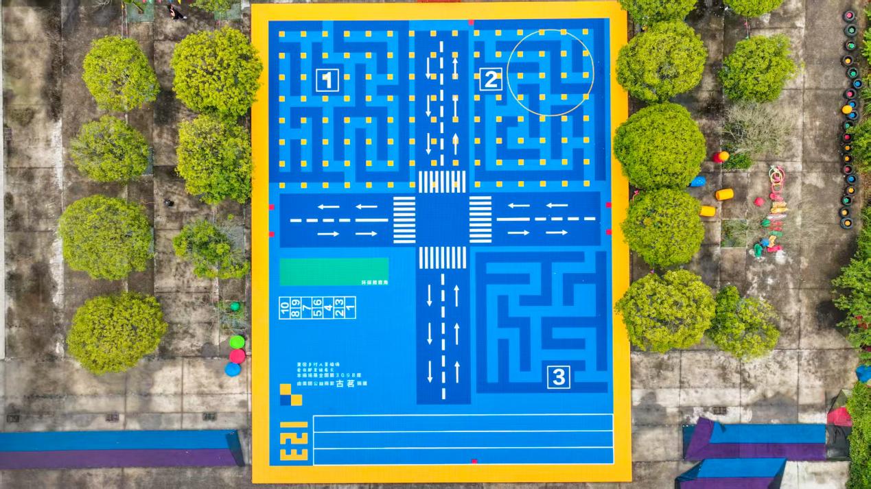 光拼接好场地还不够,每一块地板上还有特殊图案,组合后将操场分为了由十字路口分割的4块区域,形成了迷宫区、交通安全教育区、彩虹伞区、站点区、环保教育角、跑道区、跳房子区、足球篮球区8个功能区。