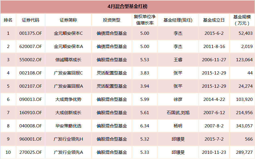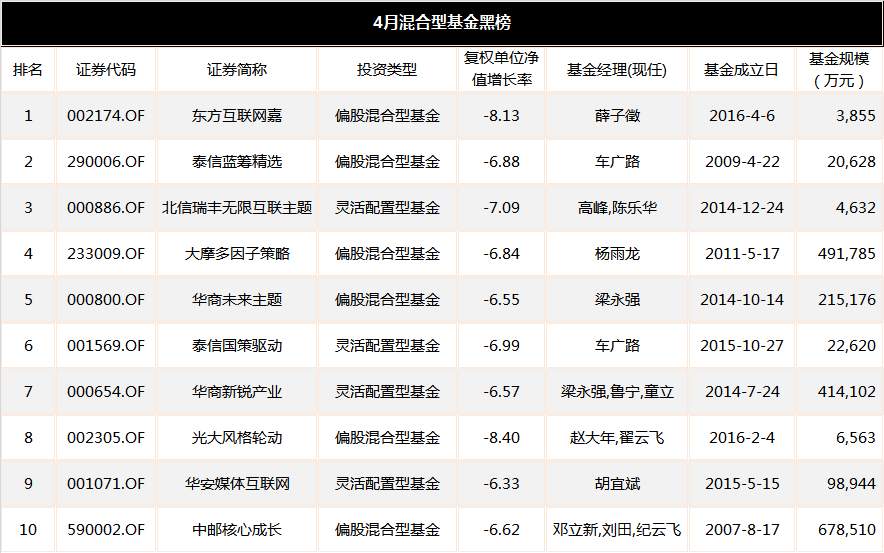 本篇为混合型基金红黑榜。据Wind资讯数据统计,4月全市场存续混合型基金共有2442只,4月平均收益率为-0.21%,上月平均收益率0.67%。