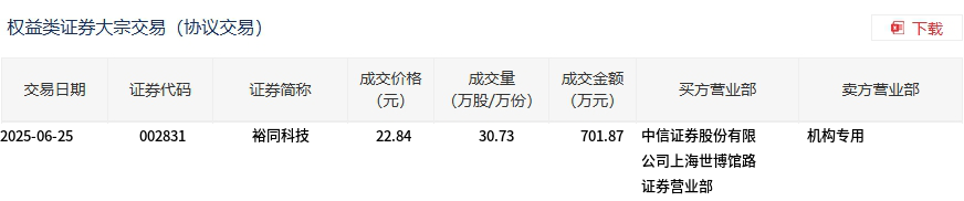 6月25日,裕同科技大宗交易成交30.73万股,成交额701.87万元,占当日总成交额的8.87%,成交价22.84元,较市场收盘价22.76元溢价0.35%。