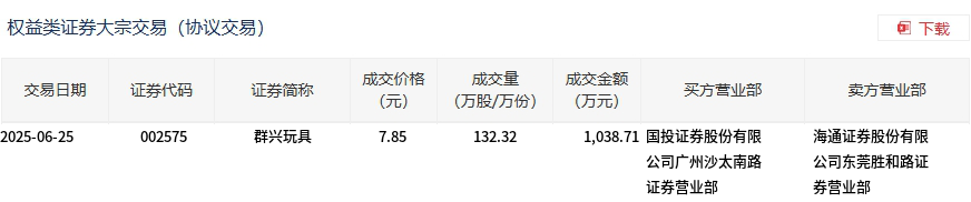 群兴玩具今日大宗交易折价成交132.32万股,成交额1038.71万元