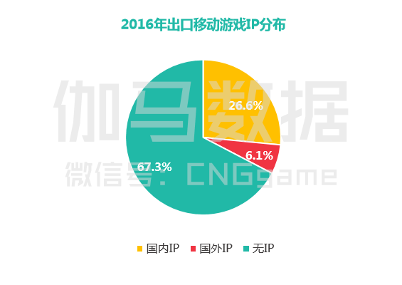 去年,任天堂推出的《Pokemon Go!》、《超级马里奥》以及Supercell推出的《皇室战争》引爆市场,让不少行业人士深切认知到大IP在全球化中的引爆性威力。而目前,出口手游却高达67%没有IP,其中国内IP又占了IP产品的80%以上,多为三国、西游、武侠等在港澳台、东南亚等文化背景相似的地区才有优势的IP。