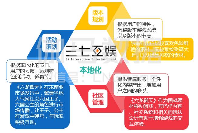 三七互娱在对当地用户偏好和本地化运营方面有着相当深入的研究。以《六龙御天》的发行为例,在选产品方面,这款PVP内容、社交系统出色的产品本身在东南亚地区接受程度较高,而国战题材的产品又是稀缺品;本地化方面,三七互娱根据用户的特性,调整版本游戏系统以及版本的节奏;用户方面,游戏本身的设计,从版本规划、活动策划、社区管理三个方面,提供专属服务。细致到素材也选择了东南亚用户偏好的色彩鲜艳的画风。