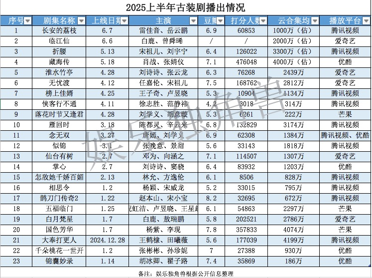 据娱乐独角兽不完全统计,今年上半年各平台共上线了23部古装剧,包揽了仙侠、权谋、商战、喜剧等多类型题材。艺恩报告显示,暑期档热门待播古装剧还有16部,其中不乏《锦绣芳华》《凡人修仙传》等颇受期待的作品。