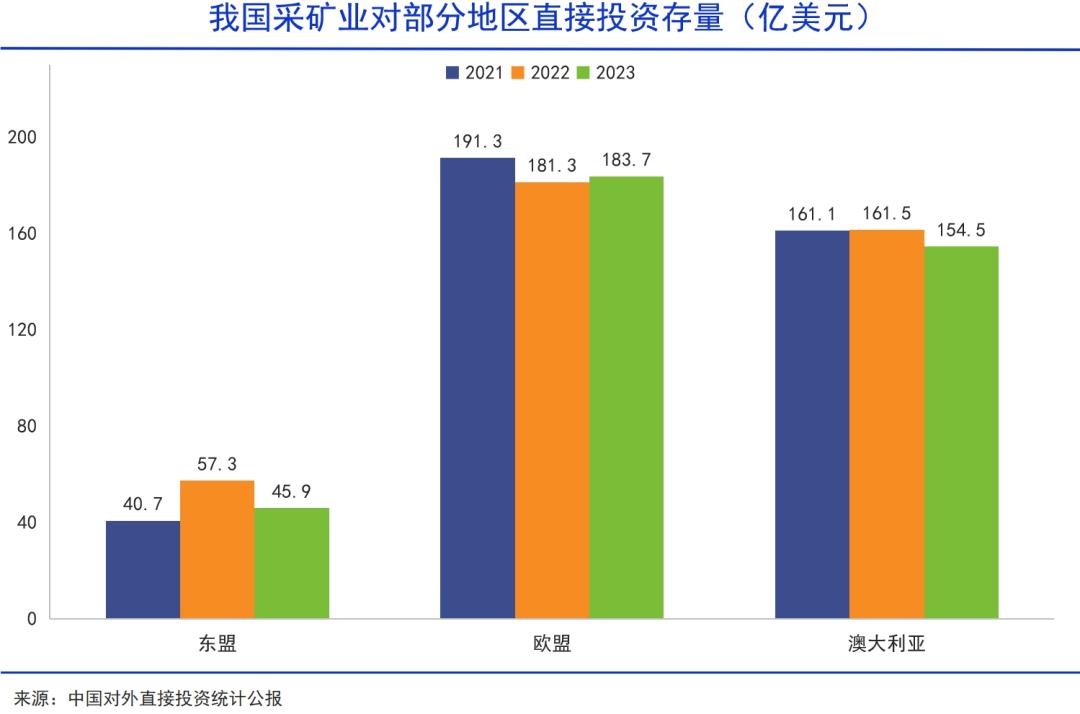 中国对外直接投资公报显示,2021-2023年间,我国采矿业对欧盟、澳大利亚投资整体下行,但对东盟的投资整体在增加。同时,据多方报道,中国在非洲的权益矿布局也在提速,且在从仅投资上游矿产向投资整条产业链的方向演进。