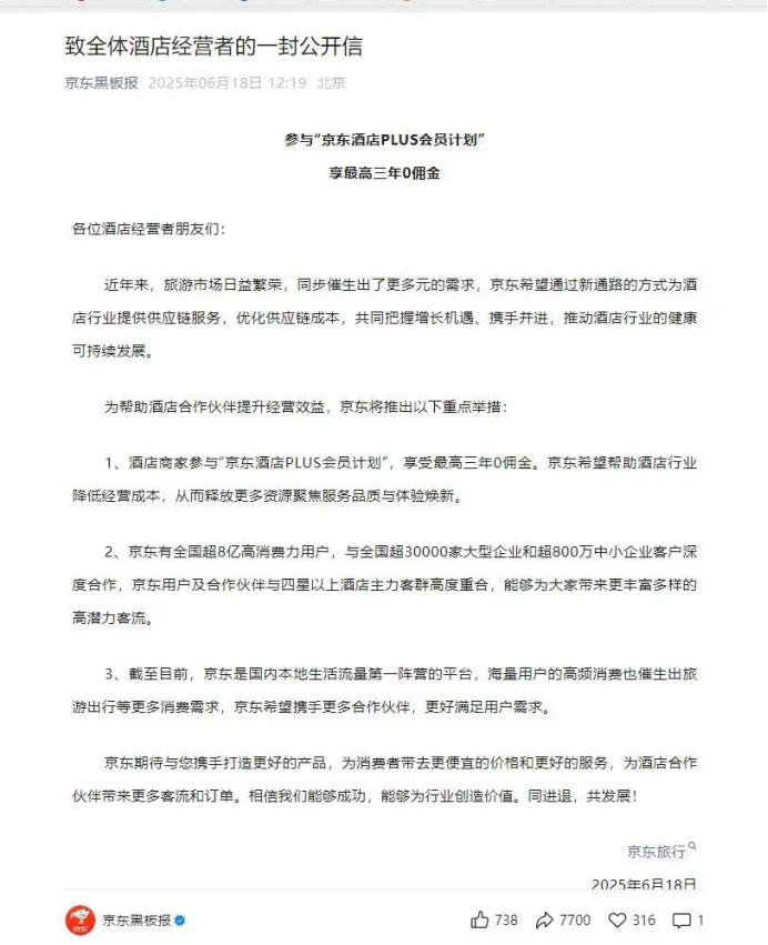 最近,酒旅行业可谓是被一颗重磅炸弹搅得沸沸扬扬。京东突然宣布以“三年 0 佣金”的策略强势进军酒旅市场,这一消息瞬间点燃了整个行业,犹如一颗投入平静湖面的巨石,激起千层浪。