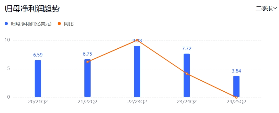 据其2025财年第二季度财报显示,星巴克全球总营收87.54亿美元,同比微增2.31%;归母净利润3.84亿美元,较去年7.72亿美元骤降50.26%。