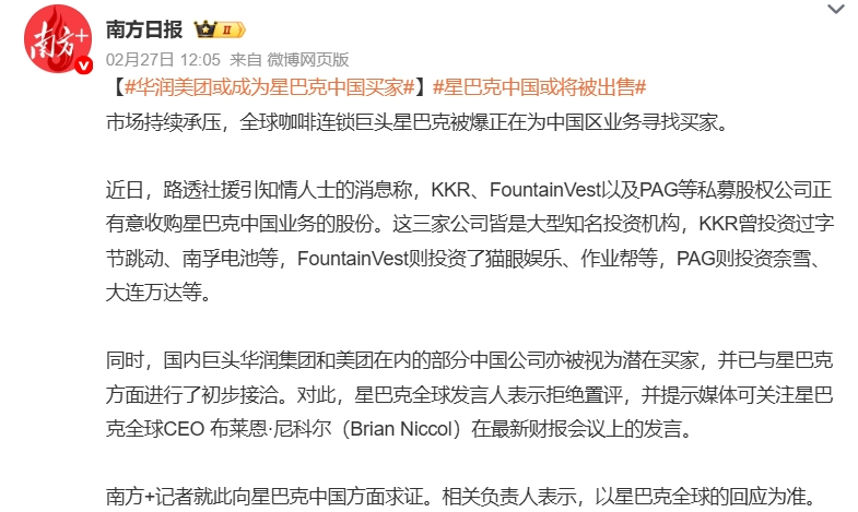 星巴克中国方面回应称,“我们正在评估把握未来增长机遇的最佳方式。我们将继续专注于实现中国业务的重振增长,保持积极正向的发展趋势。可以确认的是,星巴克目前没有考虑完全出售中国业务。”