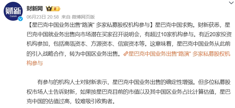 6月11日,星巴克CEO布莱恩·尼科尔(Brian Niccol)表示可能出售中国业务部分股权,以吸引外部投资者并恢复其在华增长。