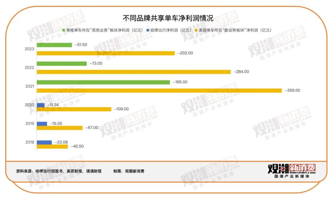 青桔和美团也没有好到哪去,据财报显示,美团2022年与2023年内共享单车所属的新业务经营由亏损283.79亿元收窄至201.66亿元;而青桔单车2023年单车业务所在版块的净利润亏损仍超过50亿元。