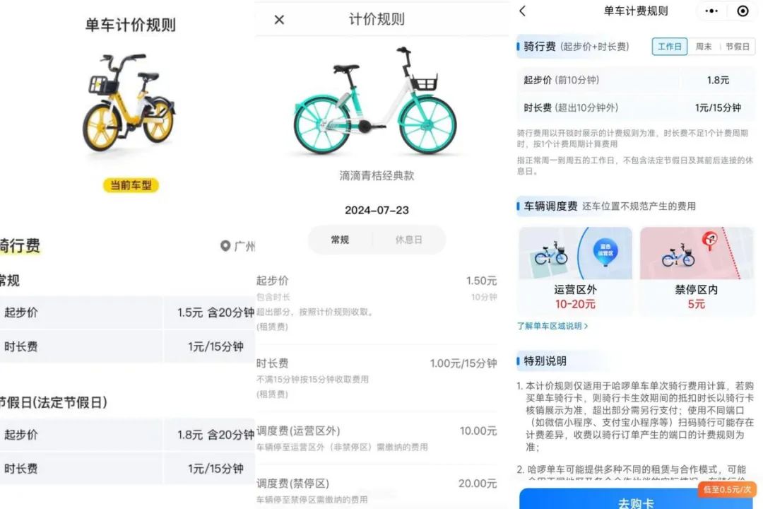 到了2023年7月,哈啰、美团、青桔这三大共享单车头部平台在国内部分城市的起步价已涨到了1.5元/15分钟,超时后每10分钟1元或每15分钟1元,单次1小时骑行费用为4.5元~6.5元。甚至共享单车平台还区分周末及法定节假日、工作日来收费,甚至还因车型不同而有不同价格。