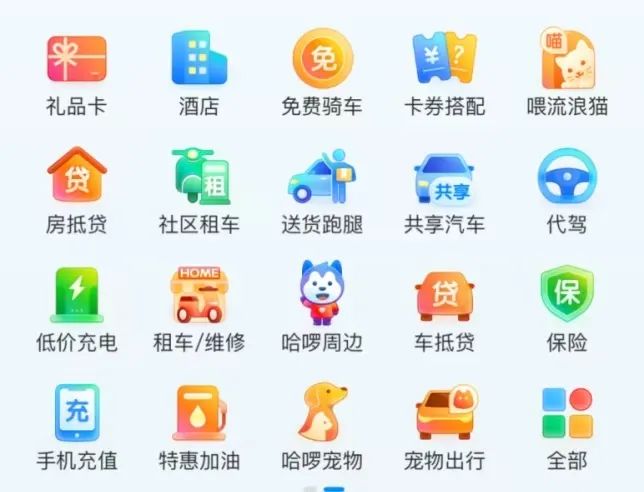 在哈啰APP上,已有出行、生活、福利3个板块,共计33个入口:出行板块涉及打车、顺风车、骑行、买电动车、租电动车、哈啰租车等12个入口;生活板块涉及车主服务、代驾、借钱、汽车充电、哈啰宠物、特惠美食、门票游玩等16个入口;福利板块涉及优惠卡券、超级会员等5个入口。