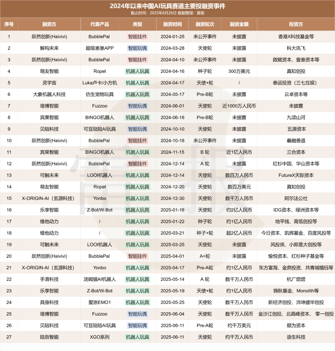 除了近期的多起融资外,据雷报不完全统计,从2024年至今,国内AI玩具赛道已至少有27起投融资事件,且其中有6起亿级、9起千万级投资,具体情况如下: