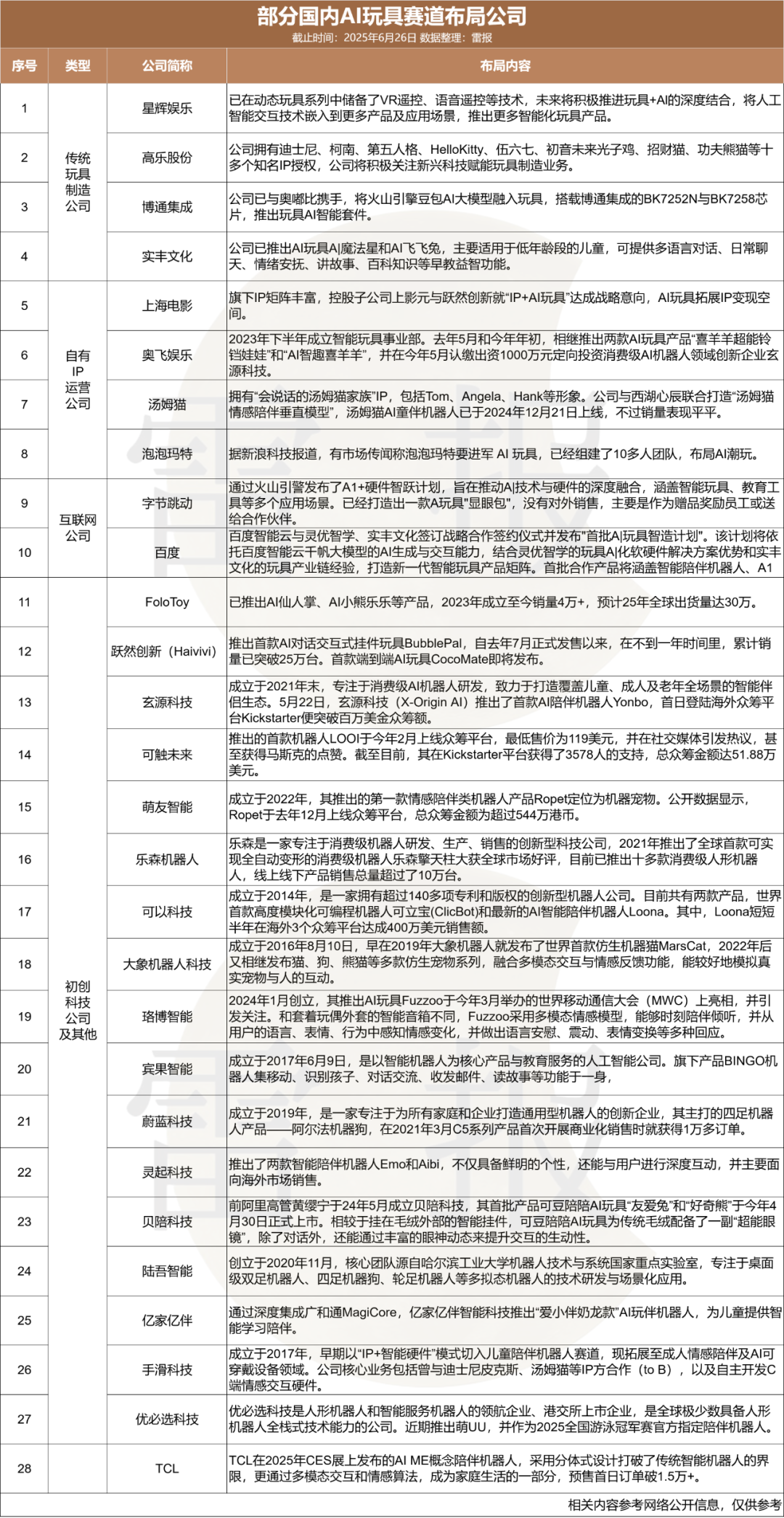 目前,我国AI玩具赛道主要布局公司包括四大类,分别是:传统玩具制造公司,包括实丰文化、星辉娱乐等;自有IP运营公司,包括奥飞娱乐、汤姆猫等; 互联网公司,包括字节跳动、百度等;初创科技公司及其他,包括上文提及的跃然创新、FoloToy、珞博智能等,该类公司整体上入局更早且推出的产品类型多元,并已在海内外市场有不错表现。