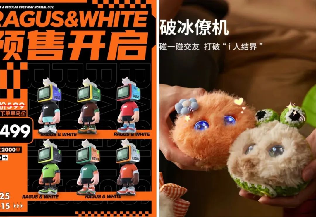 再如,银屿趣玩旗下厂牌奇妙拉比MarveLab近期推出的RAGUS,可以称得上是“标准的”AI潮玩。这个长着电视脑袋、喜欢穿造型各异衣服的“男孩”有着7种不同的造型,且可以绑定不同的数字人格,同时公司还围绕产品设计了“人类和AI共存共生的奇迹之地CRT77”这样完整的世界观。
