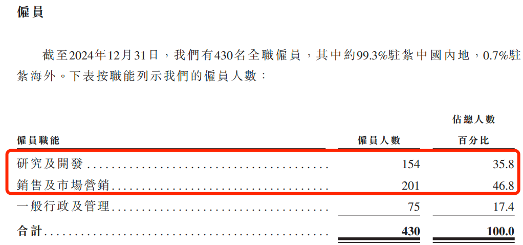 从员工分布上也可以看到,仙工智能对销售的重视。截至2024年12月31日,公司共有430名全职员工,其中销售及市场营销的员工201人,占总人数的比例高达46.8%。