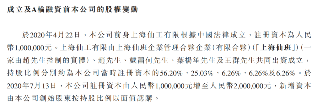 2020年4月,上海仙班、赵越、戴萧何、叶杨笙及王群共同出资成立了仙工智能的前身上海仙工有限,持股比例分别约为56.20%、25.03%、6.26%、6.26%和6.26%。