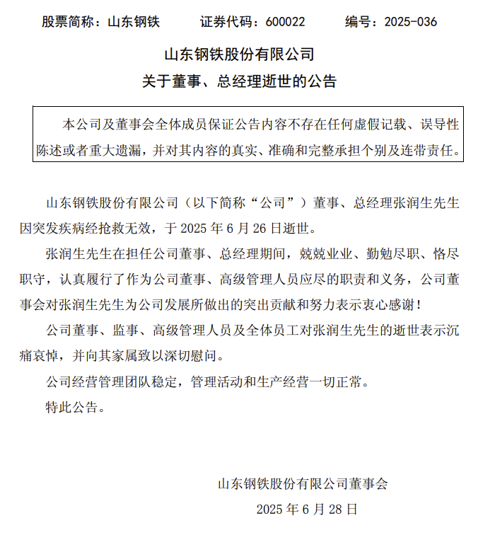 6月27日下午,山东钢铁公告,公司董事、总经理张润生因突发疾病经抢救无效,于2025年6月26日逝世。公司董事、监事、高级管理人员及全体员工对张润生先生的逝世表示沉痛哀悼,并向其家属致以深切慰问。公司经营管理团队稳定,管理活动和生产经营一切正常。