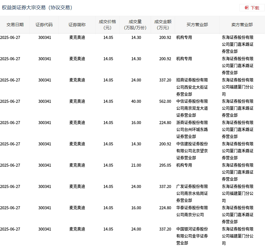 6月27日,麦克奥迪大宗交易成交207.9万股,成交额2921.01万元,占当日总成交额的9.63%,成交价14.05元,较市场收盘价16.05元折价12.46%。