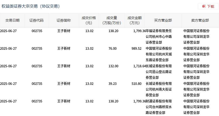 6月27日,王子新材大宗交易成交523.63万股,成交额6817.68万元,占当日总成交额的15.61%,成交价13.02元,较市场收盘价14.53元折价10.39%。