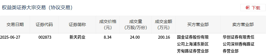 6月27日,新天药业大宗交易成交24万股,成交额200.16万元,占当日总成交额的5.85%,成交价8.34元,较市场收盘价9.25元折价9.84%。