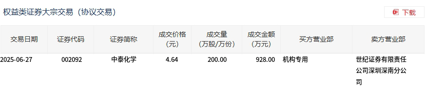 6月27日,中泰化学大宗交易成交200万股,成交额928万元,占当日总成交额的6.7%,成交价4.64元,较市场收盘价4.67元折价0.64%。