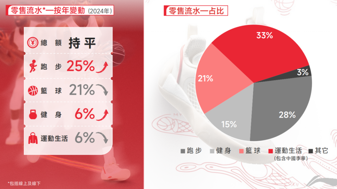 数据显示,李宁2024年的跑步零售流水同比增长25%,篮球零售流水同比下滑21%。在根据消费趋势有意识调节核心产品比重的情况下,集团主要的鞋类收入实现同比增长6.8%至143亿元,总营收增长3.9%至286.76亿元。