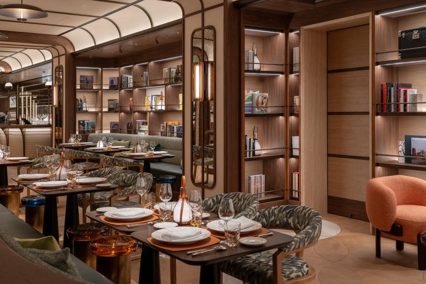 室外露台为宾客营造出优雅惬意的海滨格调。Le Café Louis Vuitton餐厅位于三层,设有吧台和雅座,可供随心小憩。精致的用餐区域巧妙融入远洋游轮元素,柔和的灯光令木质表面更显温润,书架上陈列品类丰富的精选书籍。随着路易威登餐饮在全球不断拓展其独特的烹饪版图,Le Café Louis Vuitton亦展现了“东西合璧”精髓,成就西方美学与中国文化的优雅共鸣。菜单既包含路易威登的经典菜肴,也不乏此全新的独家本地特色。