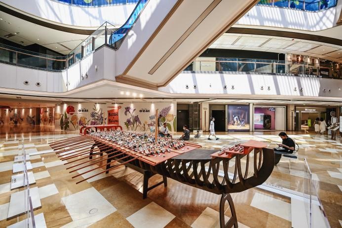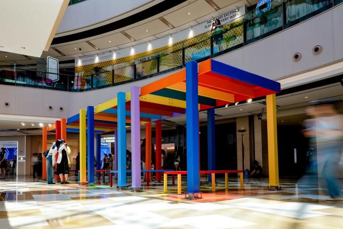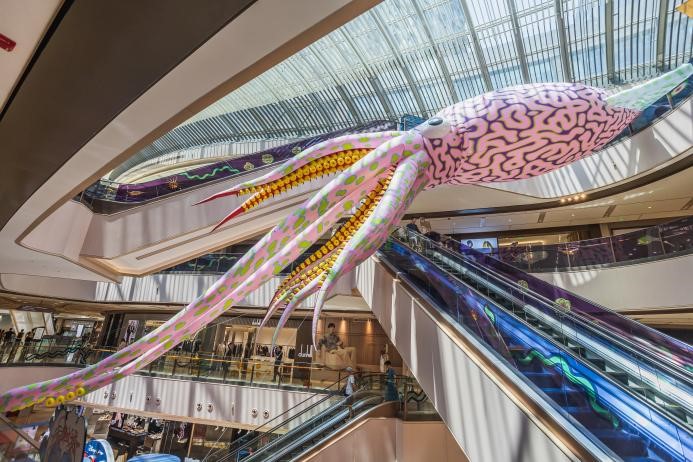 项目邀请英国“关系美学”概念奠基人利亚姆·吉利克(Liam Gillick)、日本当代艺术家竹川宣彰(Nobuaki Takekawa)及中国先锋视觉艺术家陈天灼三位艺术家共同创作。在LG1北厅,吉利克标志性的极简装置化作为色彩斑斓的“社交浮岛”,呈现作品《永续论台》——四座彩色平台构建出开放式公共场域,在有机玻璃的折射下激发日常社交与思想碰撞,引导公众在日常空间中发掘人与人之间潜藏的关系张力。LG1中厅,竹川宣彰融合深奥议题与轻盈表达,以“大航海时代”为灵感,打造一艘知识之舟《大知时代的航舟》,承载人类对知识的渴望与对方向的追寻。陈天灼全新作品《海语》横跨四个扶梯区,视觉纵深达300米,构建出一头遨游于都市“瀚海”的鲸鱼。作品围绕“印迹、浮栖、触发、回响”四个篇章展开,通过述说不同的生态叙事,唤醒人们对内在生命力的感知。