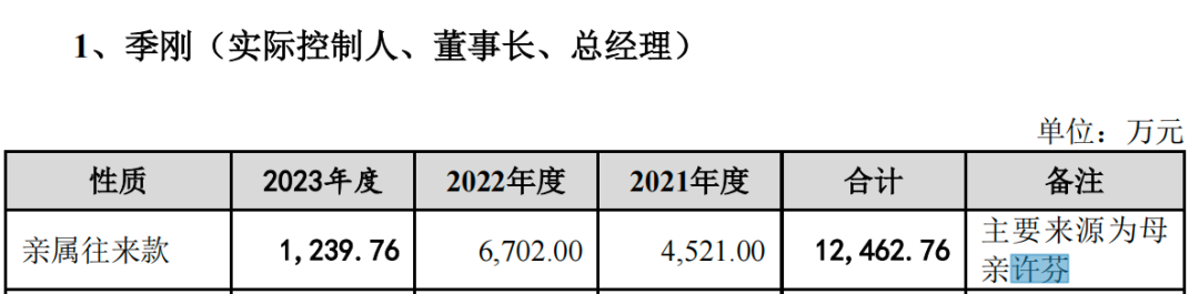 2021年至2023年,季刚收到亲属往来款金额分别为4521万元、6702万元和1239.76万元,三年合计1.25亿元,而这些款项的主要来源就是季刚的母亲许芬。
