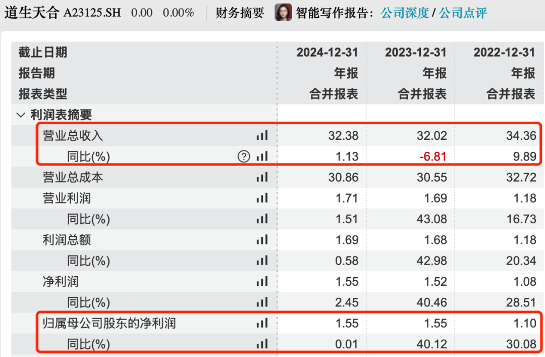报告期内,道生天合的营业收入分别为34.36亿元、32.02亿元和32.38亿元,同比增长9.89%、-6.81%和1.13%。