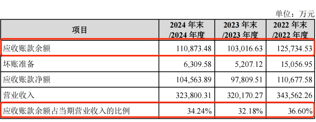 报告期内,公司应收账款余额分别为12.57亿元、10.30亿元和11.09亿元,占当期营业收入的比例分别为36.60%、32.18%和34.24%。
