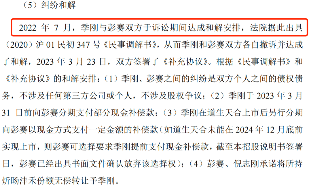 直到2022年7月,也就是在道生天合IPO申报前,双方纠纷才达成和解。按照和解安排,季刚需要在2023年3月31日前向彭赛分期支付部分现金补偿款。此外,季刚还需要在道生天合上市后,另行分期向彭赛以现金方式支付一定金额的补偿款。