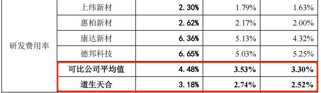 但公司的问询函回复显示,2021年至2023年,可比公司的研发费用率平均值分别为3.30%、3.53%和4.48%,均高于道生天合的研发费用率水平。