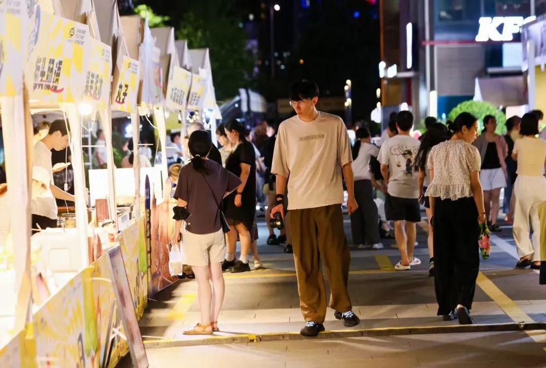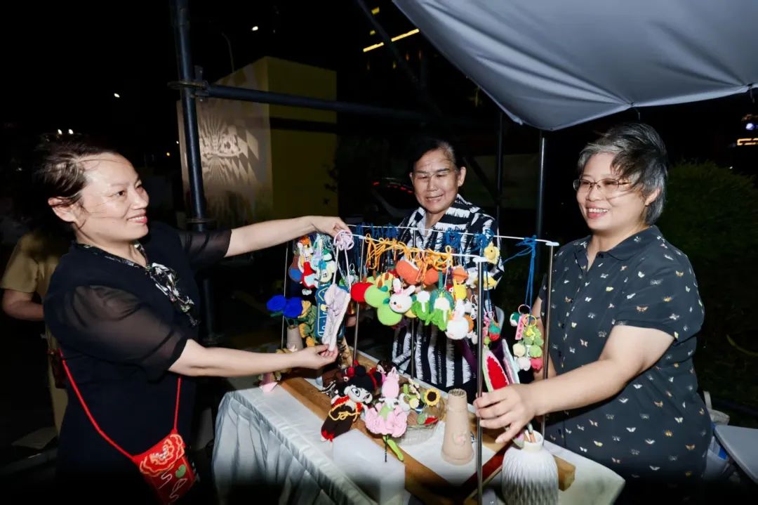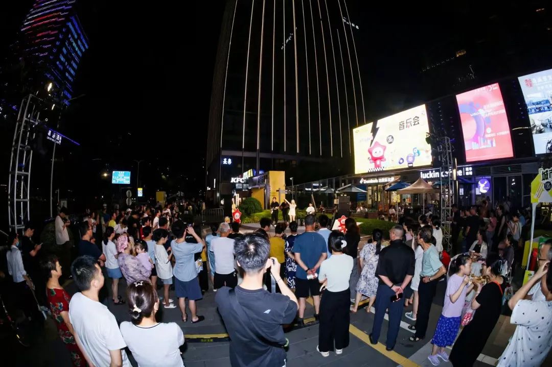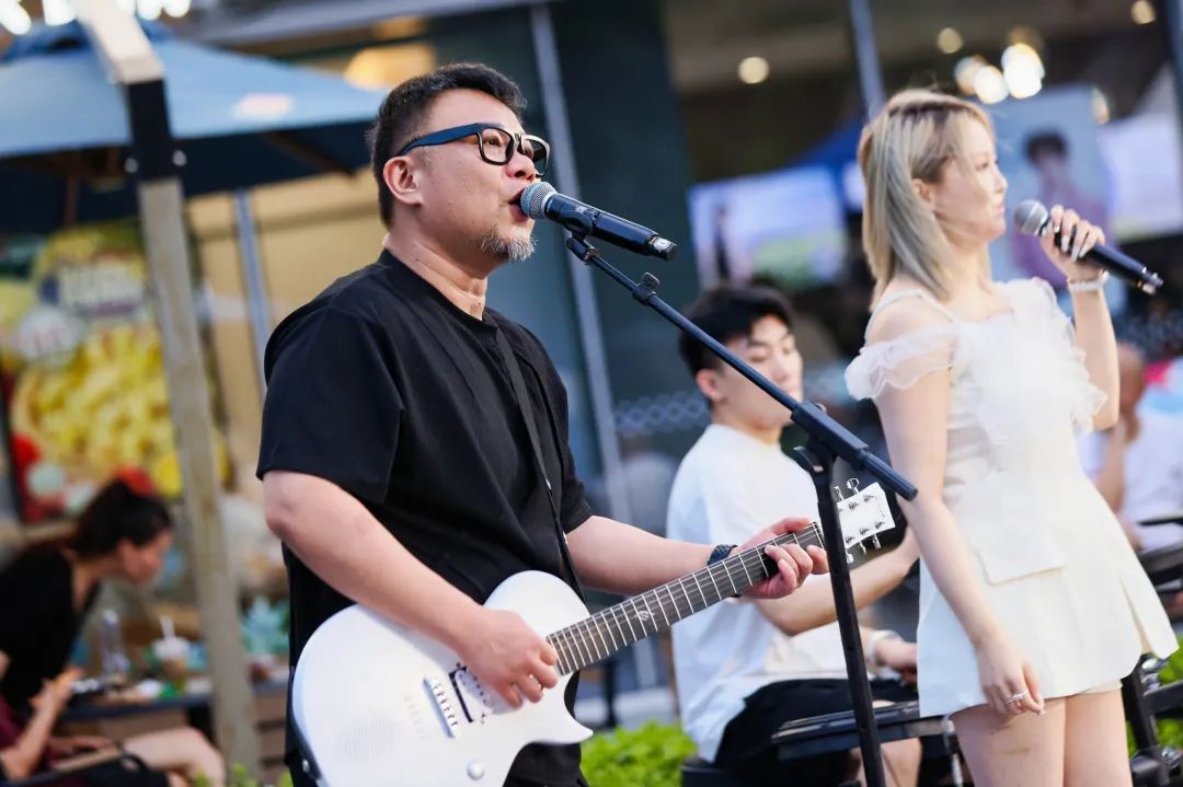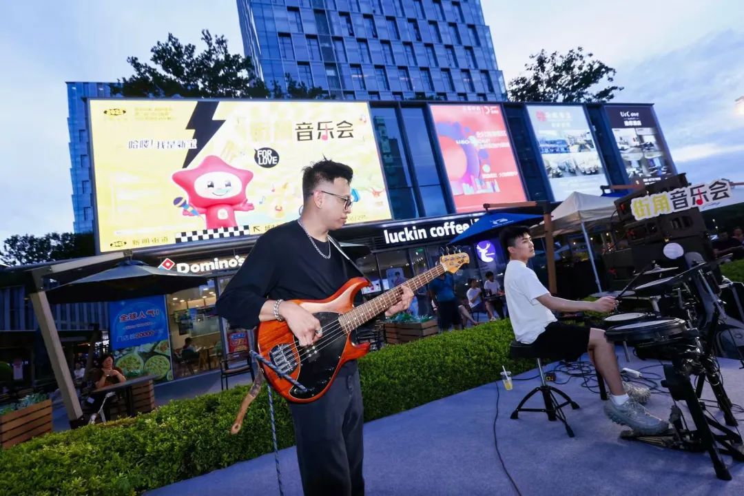 夜幕下的新明,东侧广场的主舞台上,现场乐队的音乐演出为这个夜晚增添了无限活力。现场还专门设置了美食摊位、文体集市以及特色展位,观众在享受音乐的同时,还能品尝到各式美味小吃,了解丰富的文体资讯,共享新明美好时刻。