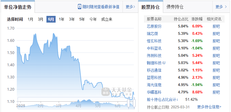 截至2025年一季度,其前十大重仓股中,芯原股份、瑞芯微等芯片设计公司占比超50%,而错失算力(如工业富联)、大模型(如科大讯飞)等核心标的。